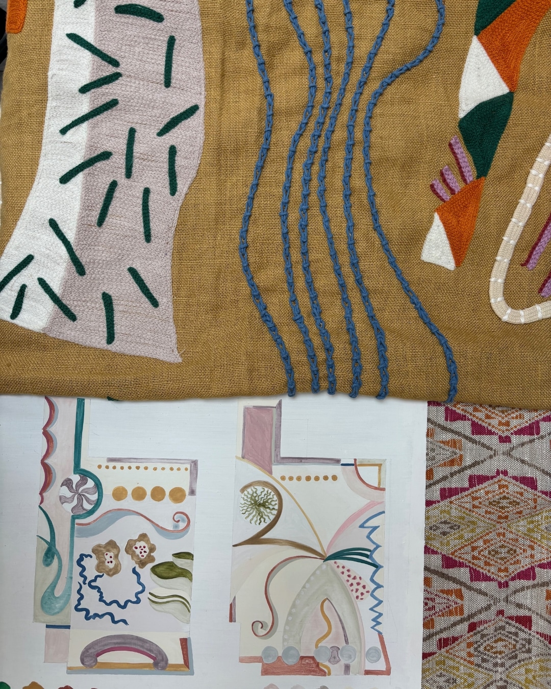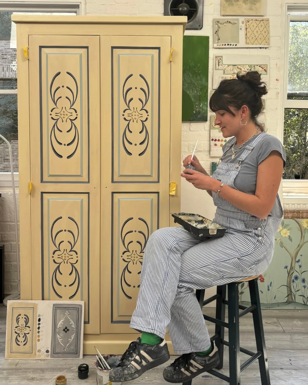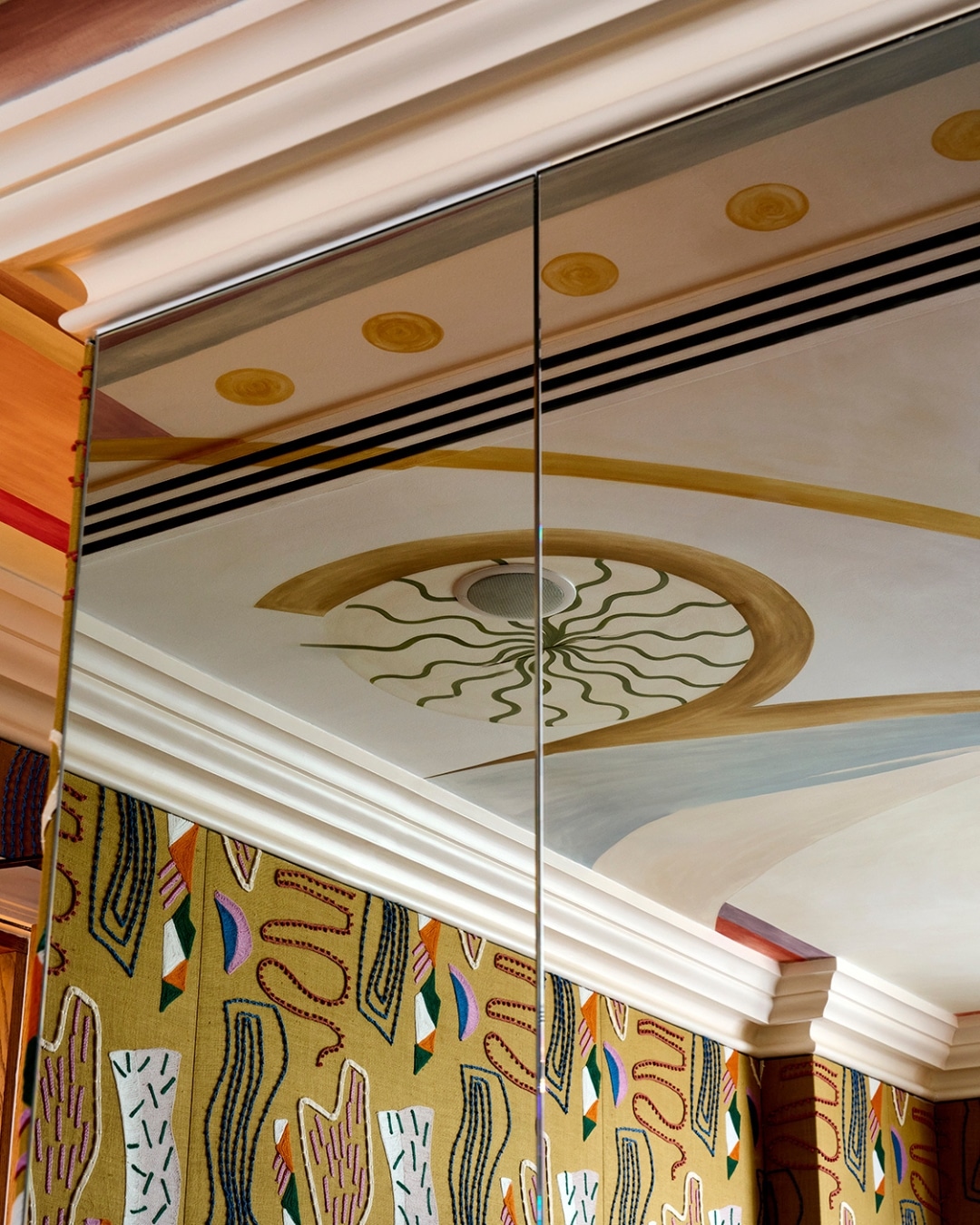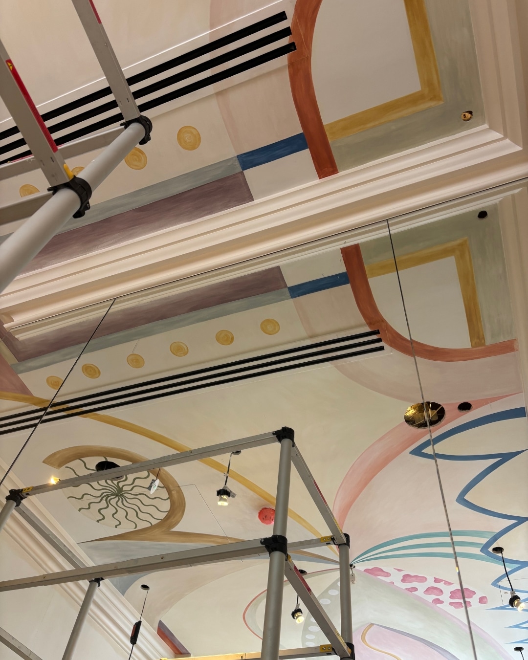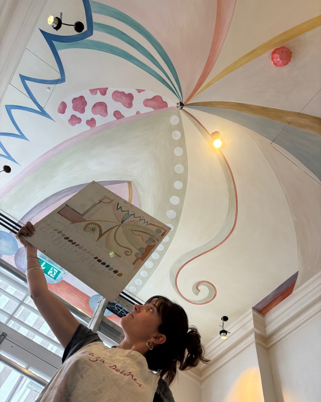 It began with spending time in the hotel and absorbing the Bloomsbury Group stories woven through the interiors. I was particularly inspired by Duncan Grant and Vanessa Bell, and especially by Alexander Hollweg’s mural in the Oscar Bar, which I loved. From there, I experimented with Bloomsbury inspired motifs, sketching and rubbing out countless ideas before pulling everything together into three final designs. I focused on ensuring the shapes flowed and felt balanced. Colour is my favourite part of the process and it develops alongside the fabrics and finishes in the room so nothing feels too loud. Once on site with the chosen design, my team and I spent a week painting through the summer and eating a lot of their delicious macaroons.