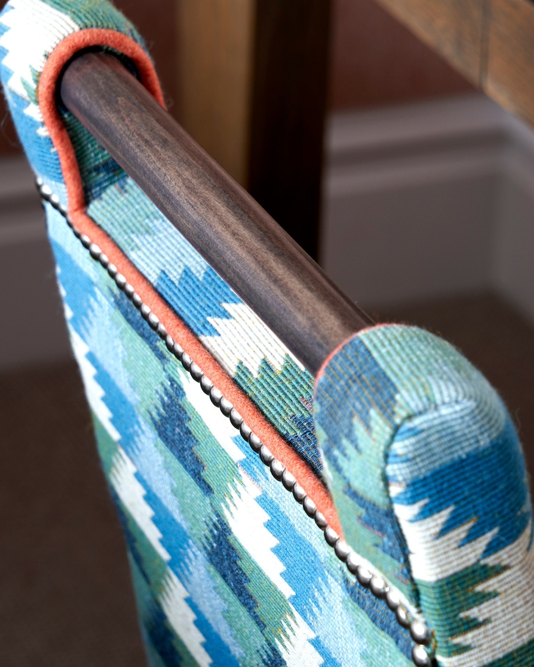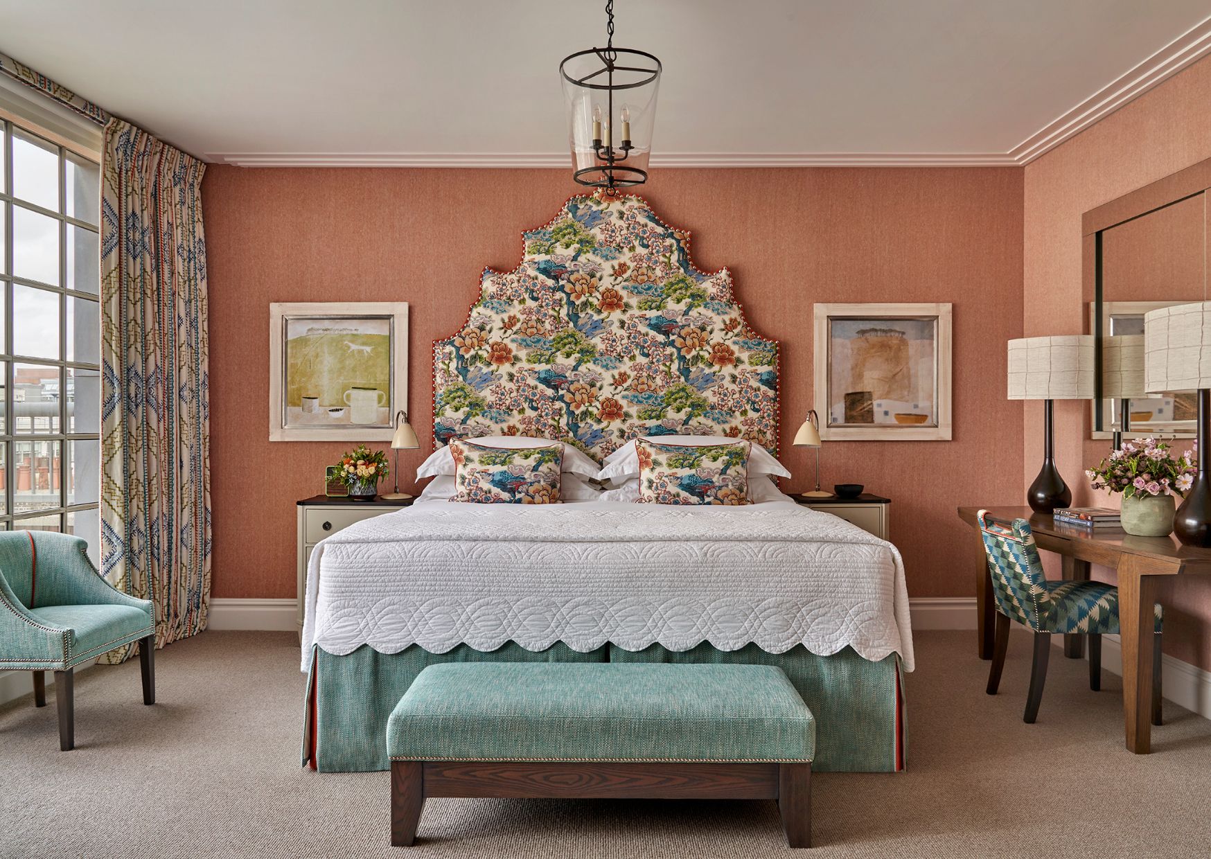 We chose our Sam Headboard for this scheme, where the interplay of sharp lines and gentle curves creates a striking focal point and lends a sense of grandeur to the room. Bold nickel studding adds confident definition, while the solid orange surround frames the headboard beautifully, bringing warmth and depth to the space.