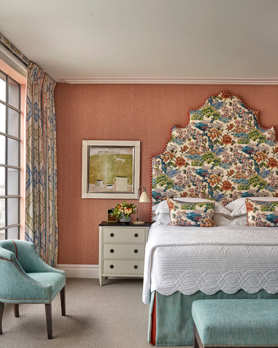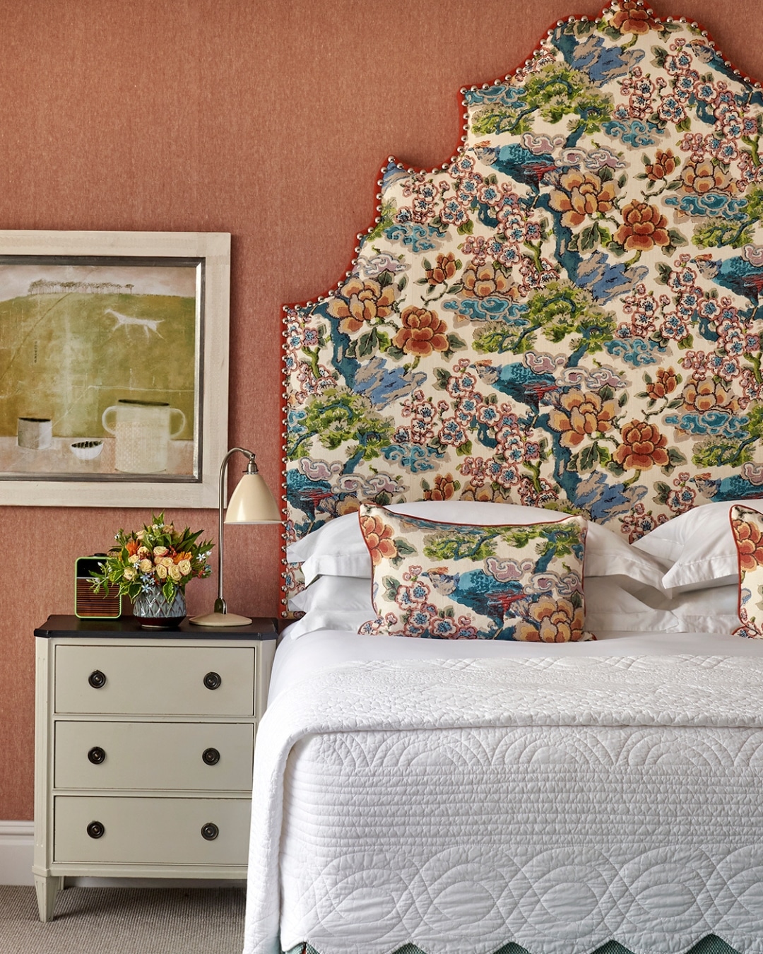 At centre stage sits a hand-blocked floral headboard in greens, blues and oranges, setting the tone and spirit of the room. The large-scale florals, with their generous white breathing space, feel like a painted oil canvas, expressive yet beautifully balanced.