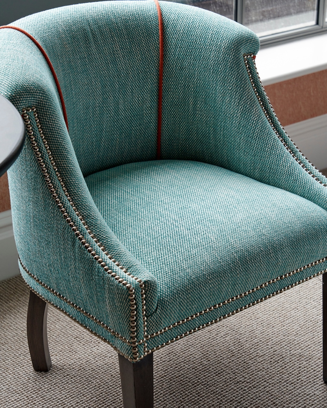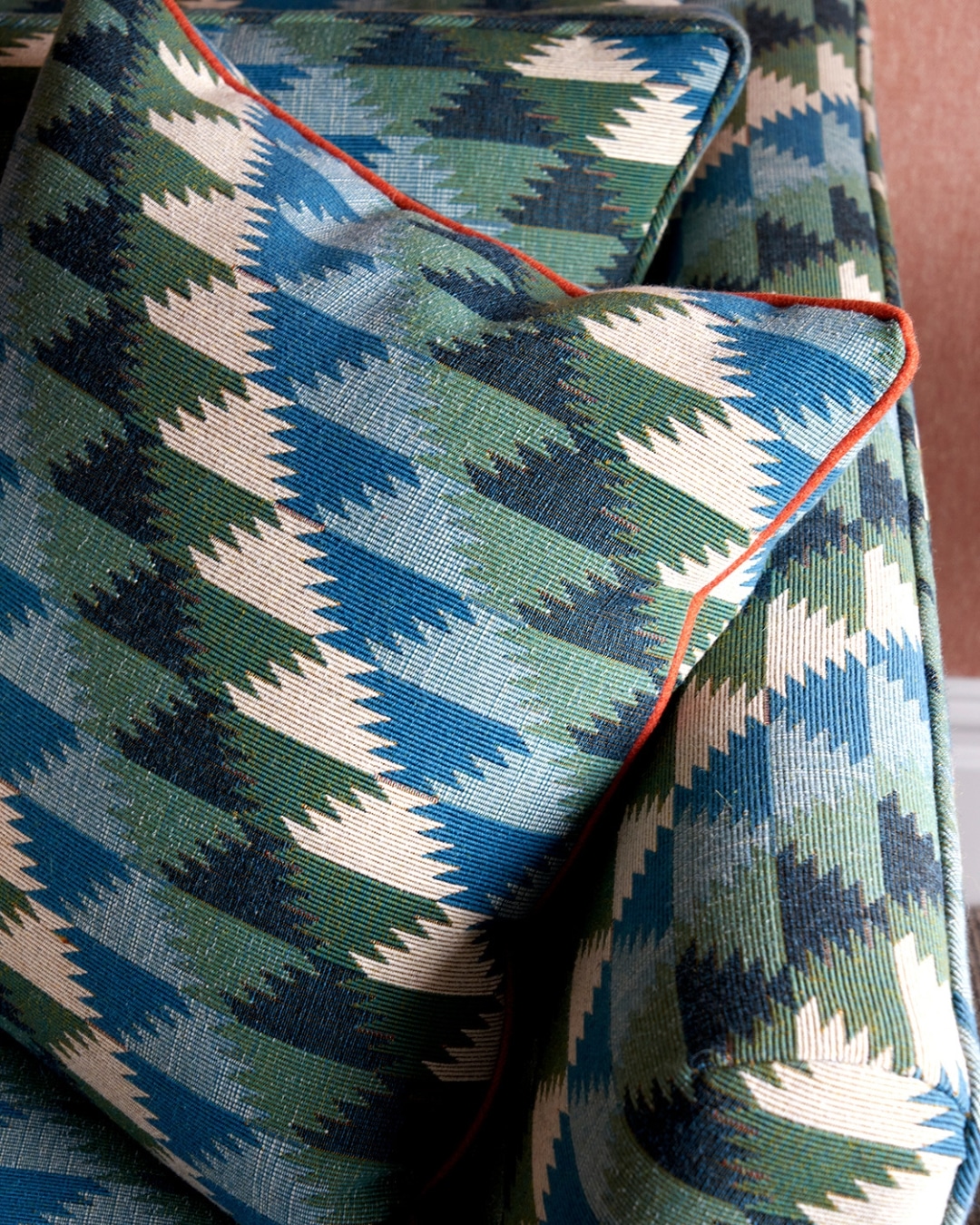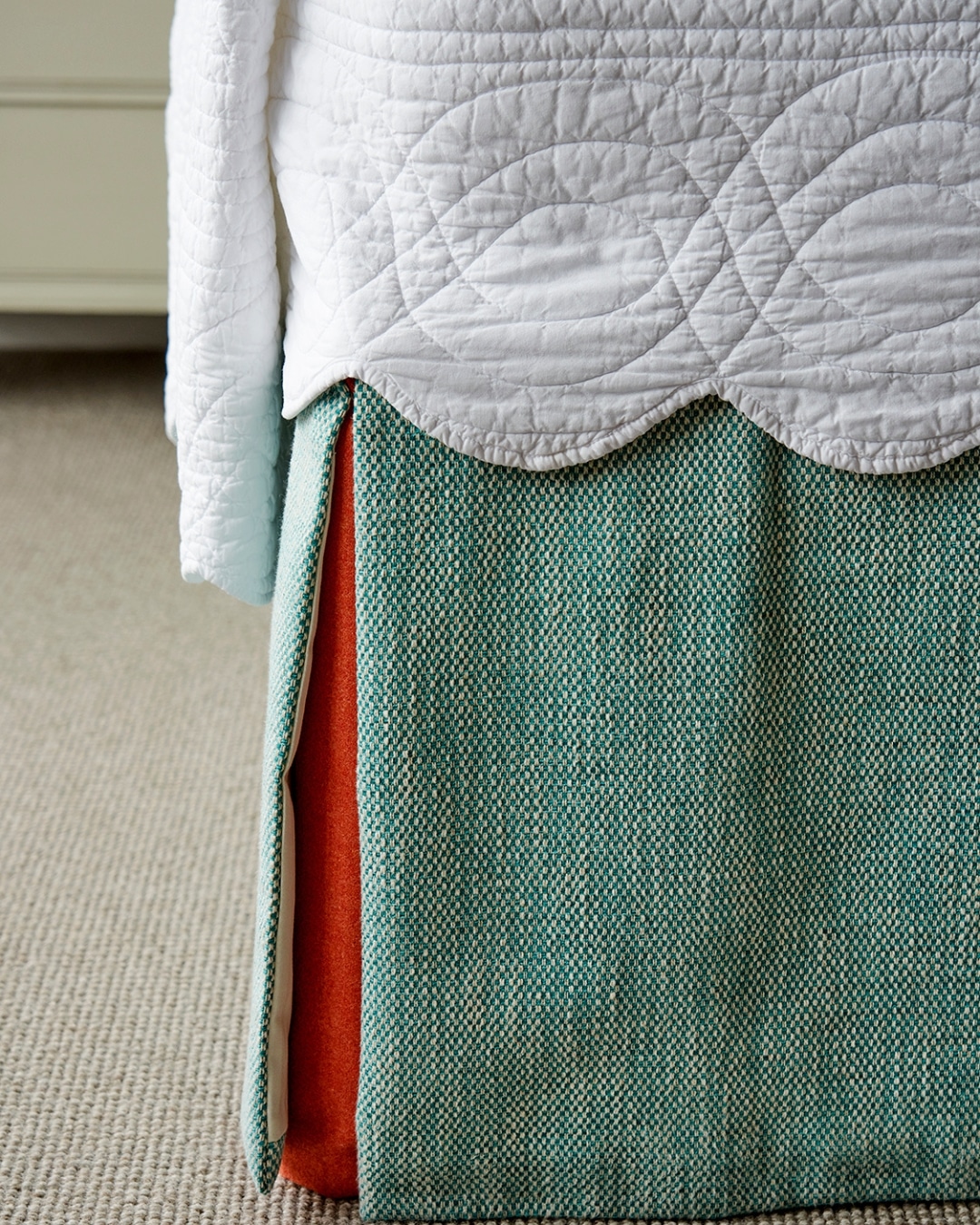 For a considered finishing touch, pops of orange appear in the piping and kick pleats of the bed valance, adding subtle rhythm and cohesion.