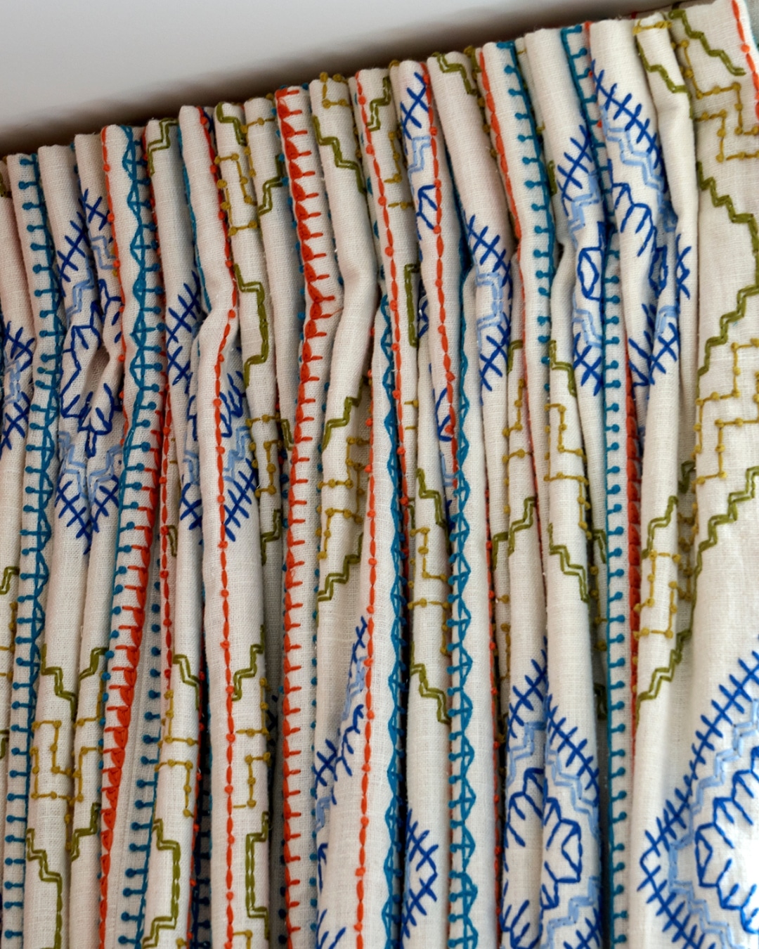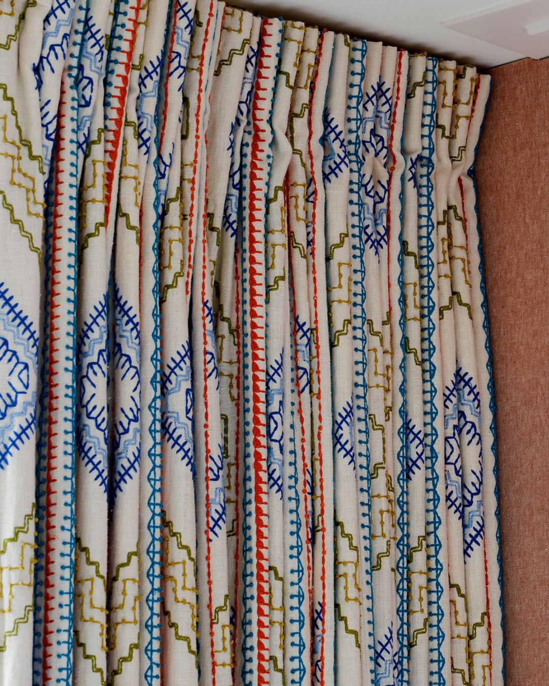The curtains introduce another layer of texture and freshness. Set against a crisp white ground, the embroidered fabric keeps the room feeling light and vibrant, while the detailing adds depth and refinement.
