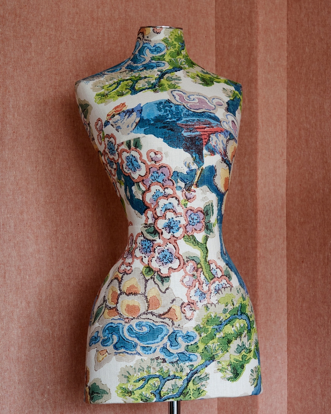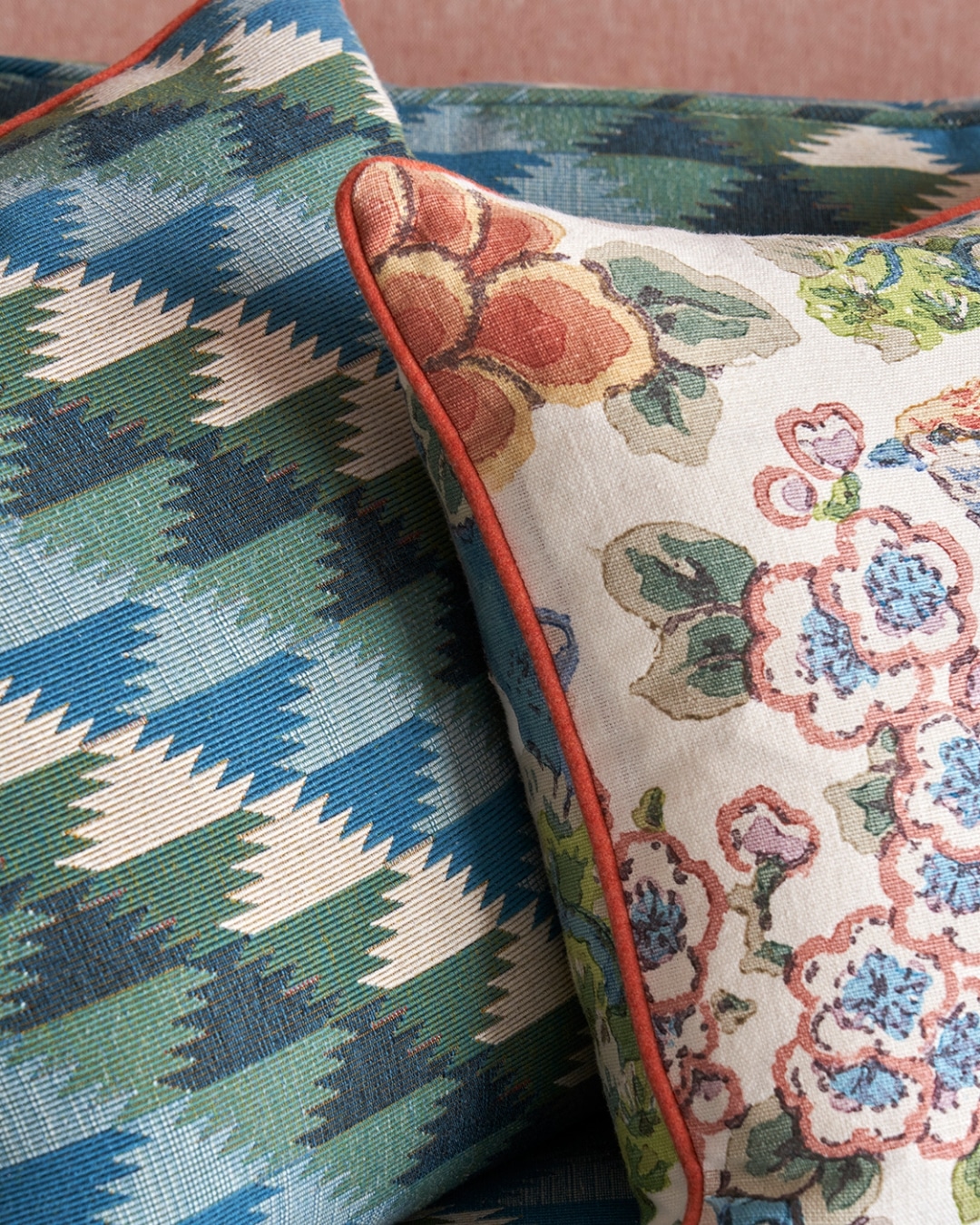 Drawing out the greens and blues from the Jean Monro floral fabric, we have upholstered the surrounding furniture in complementary plains. This thoughtful pairing creates harmony and introduces a sense of calm to the space.